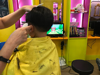 髮型師Marie姨姨先問問Alfred想看甚麼卡通片,因為每個座椅前都有專屬的小電視去看卡通!好讓小孩看著影片懷著輕鬆的心情去剪髮,之後Marie亦會問問媽媽對兒子髮型的要求(例如有否長度要求等…),整個過程,看得出Alfred由最初的緊張不安到慢慢適應過來(他全程都是忍耐及不動,比起在家為他剪髮時自問感覺輕鬆很多)。另外,髮型師Marie雖然有用上不同工具為小兒理髮,但過程都非常快速,以減低孩子的不安感!