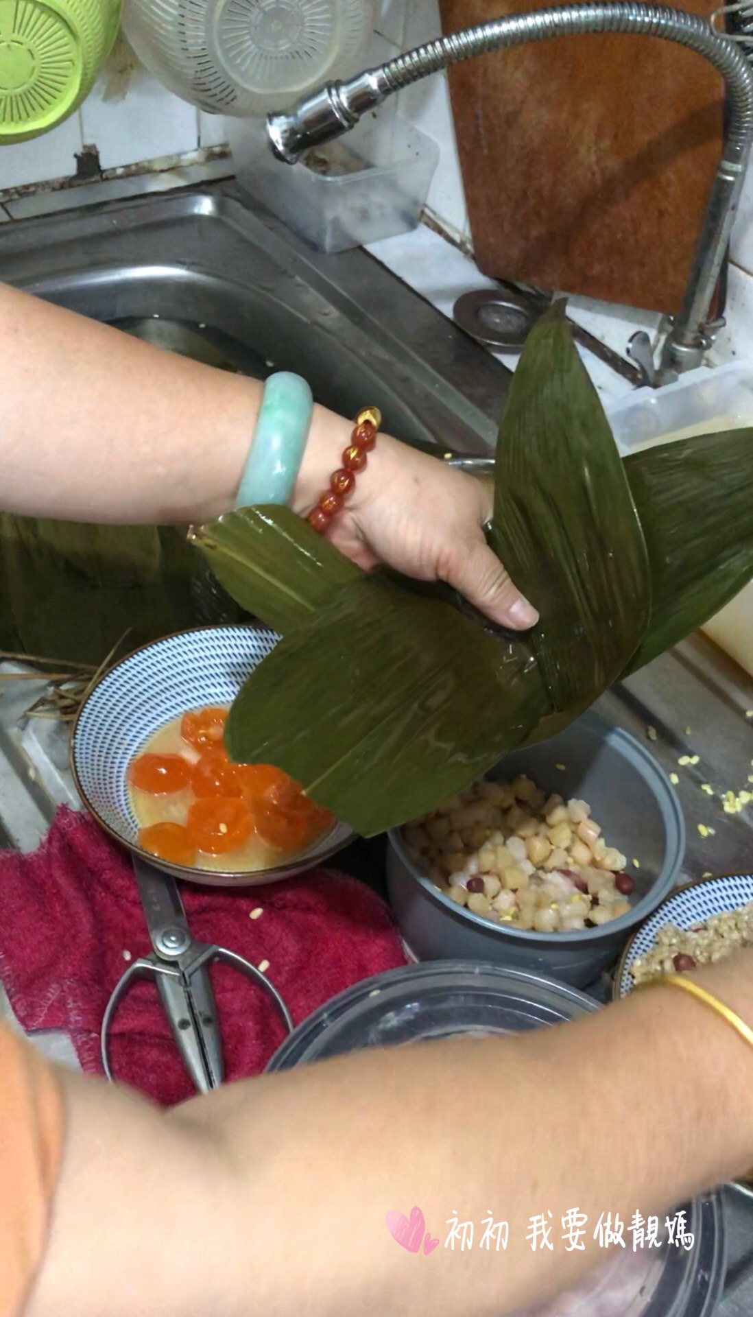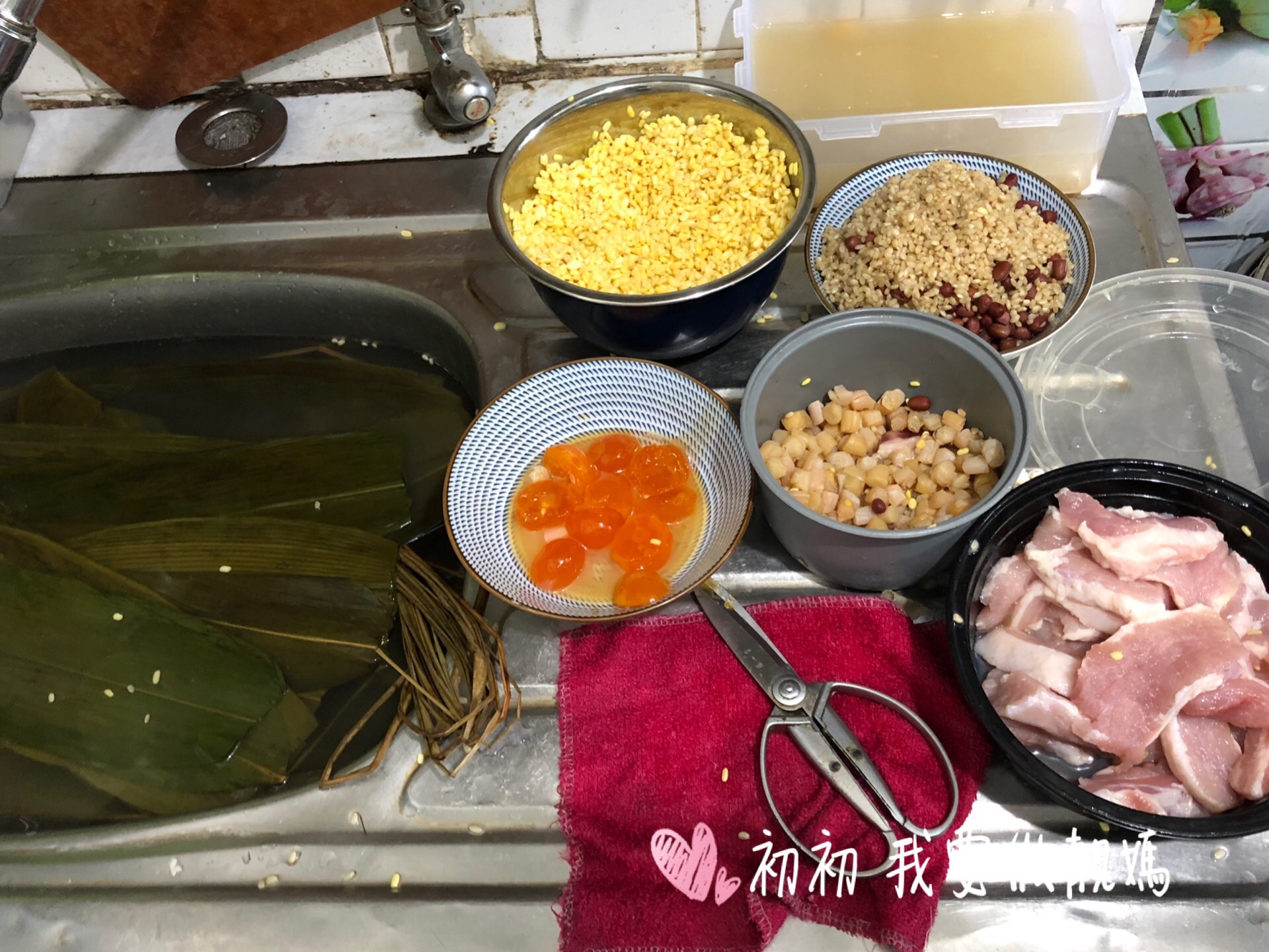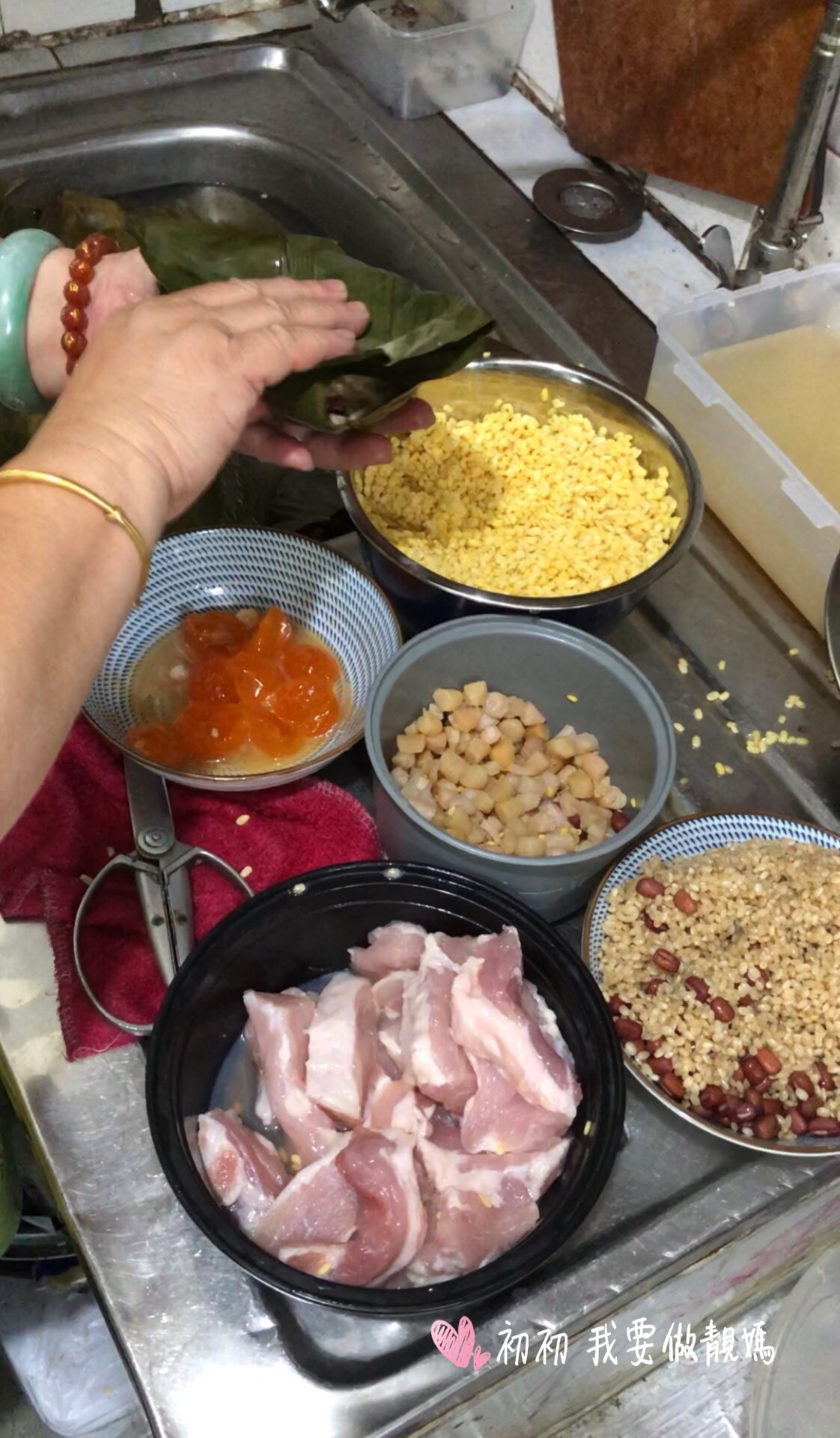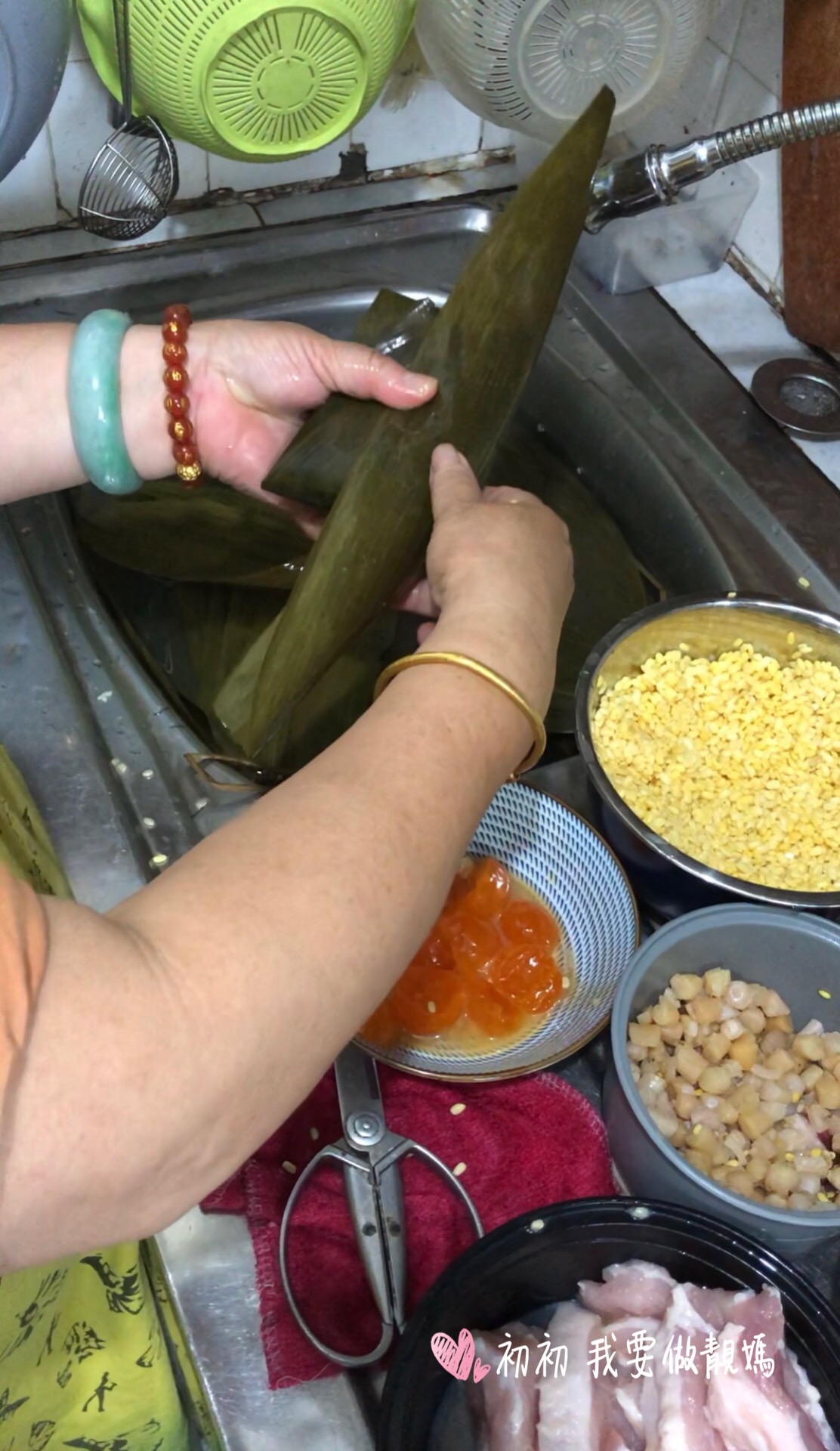 1)葉浸軟一晚洗淨,剪去頭尾,水草浸軟洗淨 2)糯米,綠豆,瑤柱浸透和加鹽調味,豬肉切塊,鹹蛋去蛋白只要蛋黃