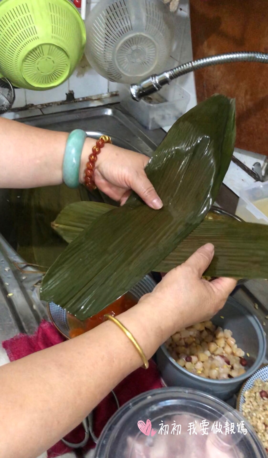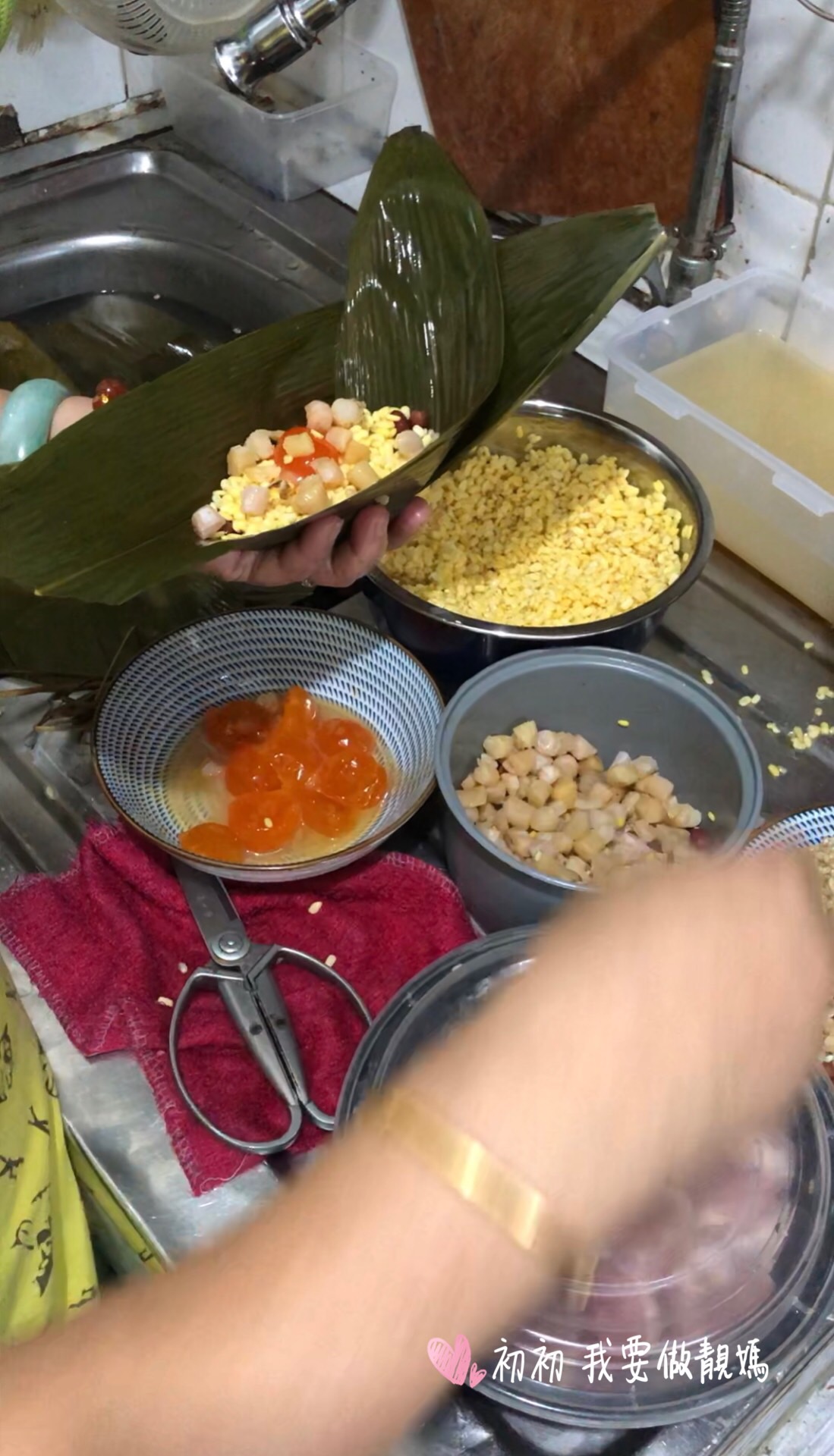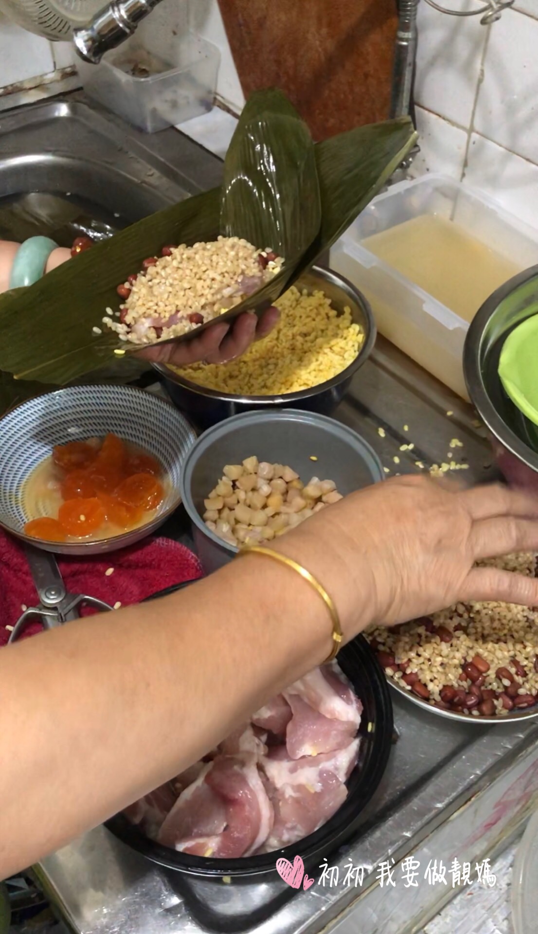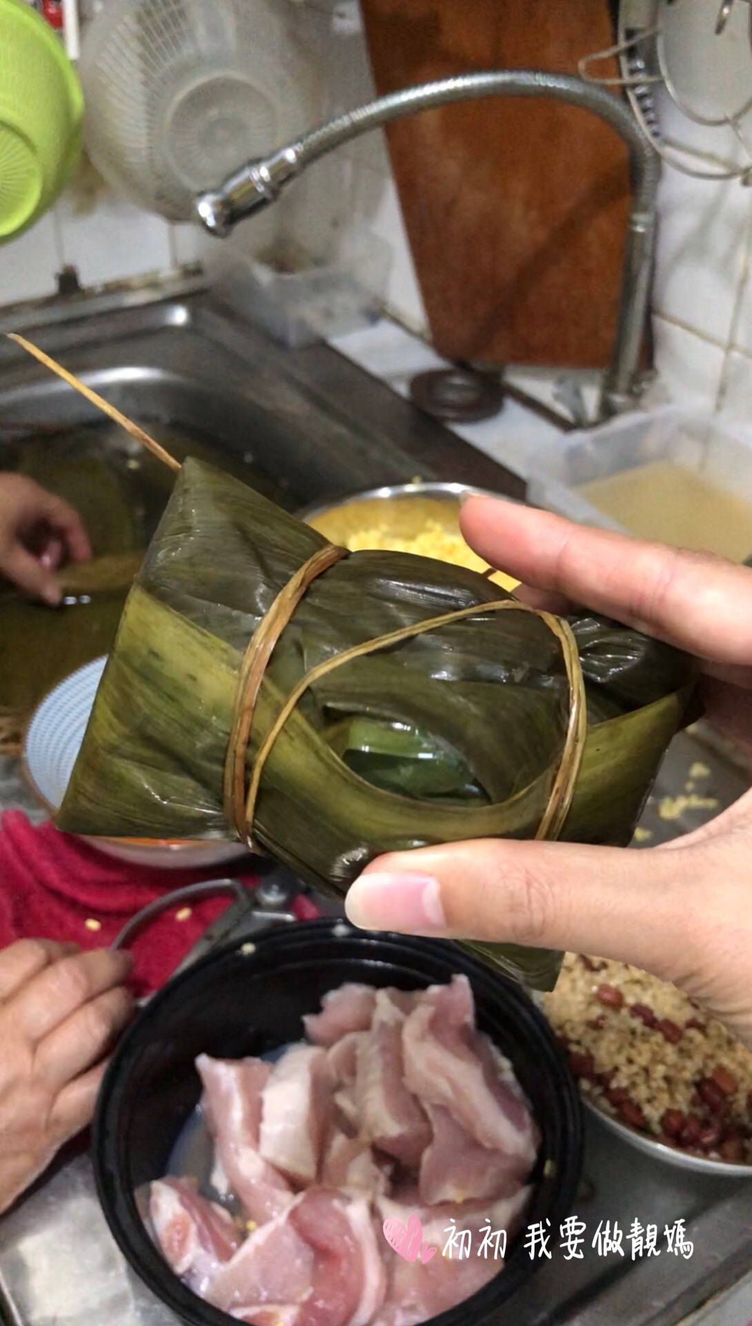 1)葉浸軟一晚洗淨,剪去頭尾,水草浸軟洗淨 2)糯米,綠豆,瑤柱浸透和加鹽調味,豬肉切塊,鹹蛋去蛋白只要蛋黃