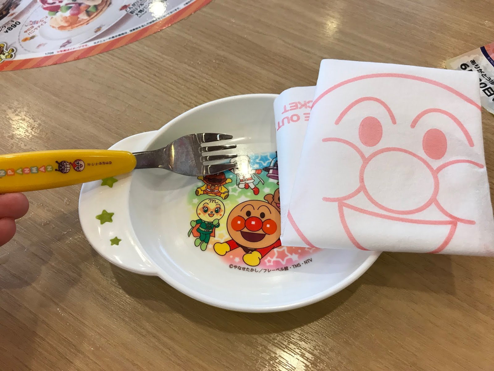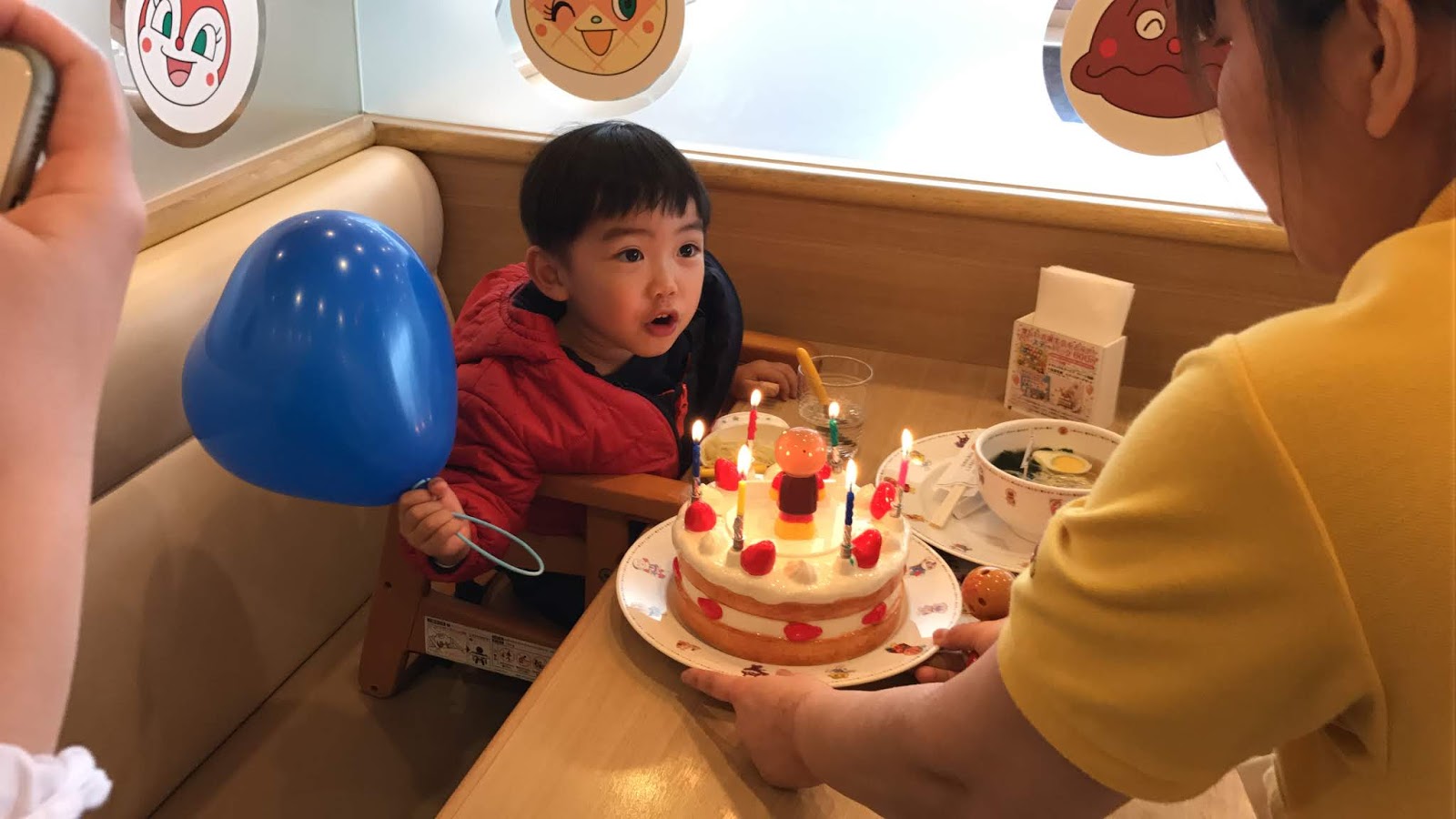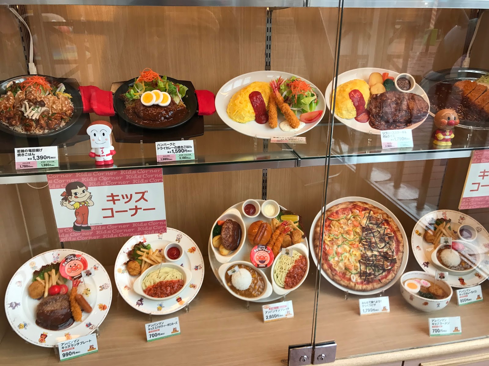 價格較高的,食物以西式為主。餐廳跟不二家合作,是麵包超人x牛奶妹的主題餐廳。餐廳裡有一個非常吸引我們前來的生日套餐服務,只需600日圓就有職員為生日主角點上蠟燭送上玩具蛋糕唱歌慶祝以及拍照留念(套餐已包贈送相片一張及氣球一個),除此之外,生日套餐亦包了一客寫上主角名字的甜點呢!氣氛超好又超划算喔!