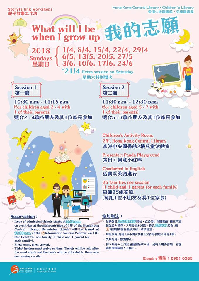 我很喜歡為Ambrose BB搜羅不同的活動,讓他的餘閒更加充實。最近參加了一次由香港中央圖書館舉辦的親子故事工作坊,主題為 “我的志願”,這個工作坊舉行日期為2018年4月1日至6月24日(逢星期日)及4月21日(星期六),時間是第一節上午10時30分至11時15分,適合2-4歲小朋友及其一位家長,第二節上午11時30分至12時30分,適合5-7歲小朋友及其一位家長,當中除了講故事,還有做手工,雖然活動以英語進行,但Ambrose BB都樂在期中。