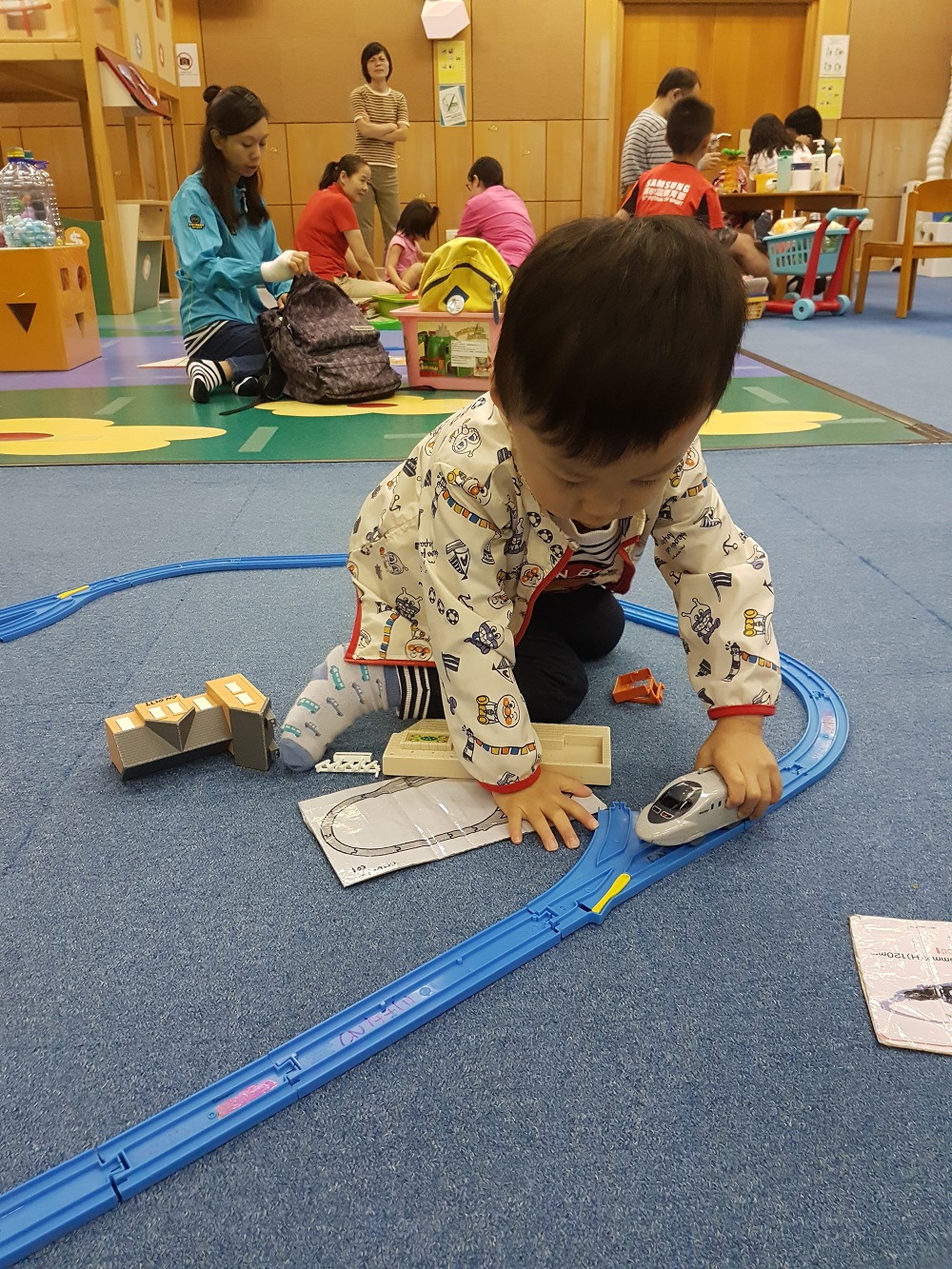 時間到了,我們可以到玩具圖書館玩了,雖然,玩具圖書館主要是借一些玩具自己玩,適合他而他喜歡的,家裡可能都已經有了,但他還是喜歡玩火車路軌,四十五分鐘一節的時間,很快又過去了。