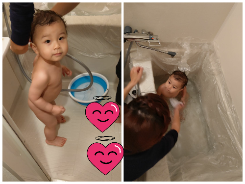 洗白白也是QQ玩水時間,帶了盤子早上梳洗及沖涼用,