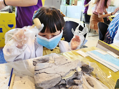 小朋友穿上實驗袍, 帶上口罩和手套, 化身小小考古博士, 親手利用清修工具小心翼翼地從化石清修出恐龍骨.