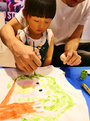 完成後只要放15分鐘左右顏料會自然乾透, QB急不及待要穿上, 繪畫得維肖維妙, 相當神似和可愛呢. Workshop後會得到一隻Bon Bear熊仔,一件Bon Bear熊仔Tee,一件小朋友自己的Tee 及workshop證書一份, 滿載而歸呢~