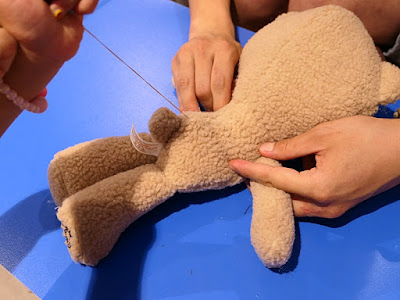 Bon Bear還未有放入棉花, 導師跟QB合力把棉花填滿熊仔的肚肚內