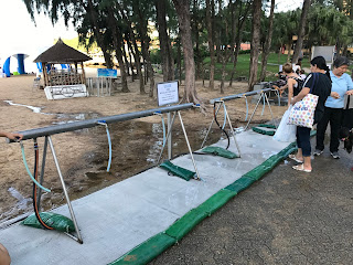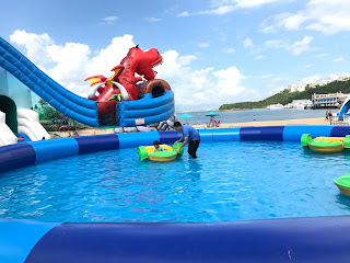 大白灣沙灘的尾部本身已設有一個沙上戶外兒童遊樂場,單是這個組合已經很好玩,暑假再加水上恐龍歷險樂園,小朋友一定非常喜歡!!!夏日滿分-水上恐龍歷險樂園,總共分為恐龍歷險世界及Q版運動會兩個部分,前者是免費的,後者則須憑「遊戲券」方可參加。而且兩個部分的遊戲都設有身高限制的。就讓我為大家詳盡介紹一下吧!