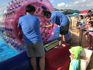 全場最囑目莫過於有三條環繞的小恐龍滑水梯,個人覺得超好玩的一個遊戲,雖然3分鐘時間不多,但我和兒子都連續滑了3次長滑梯,刺激好玩啊!而且場內亦有工作人員幫忙灑水降溫(哈哈,不過亦有機會中水槍呀!),另外,灑了水的充氣滑梯會比較「滑」,絕對是考驗體能及鍛煉身體平衡力的遊戲!