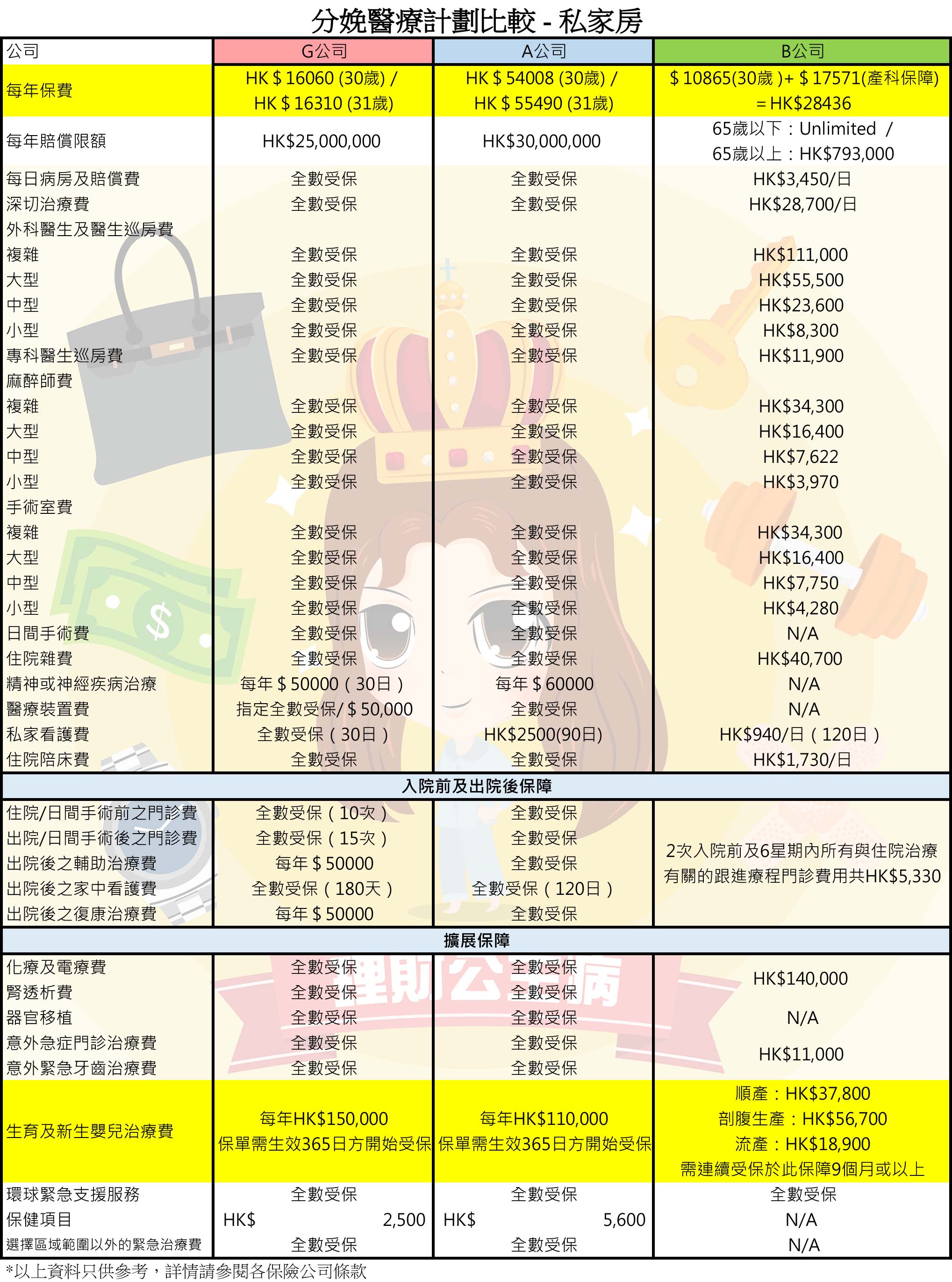 從以上比較表睇到,其實以上保險計劃本身係包含「產科保障」嘅醫療計劃,「產科保障」由3萬幾至15萬不等。當然每個計劃都有佢注意地方,如G公司及A公司嘅「產科保障」要「保單需生效365日方開始受保」,即係要連續投保兩年,係第二保單年度開始就可以享受呢個保障,去cover如產前產後檢查及入醫院生BB費用等。而B公司雖無一年等候期,但就要附加生育保障後才懷孕,及該項保障滿9個月後先有「產科保障」。所以,計劃生BB時,不妨考慮埋以上等候時間,例如婚後投保,然後享受一至兩年嘅二人世界後就生BB。