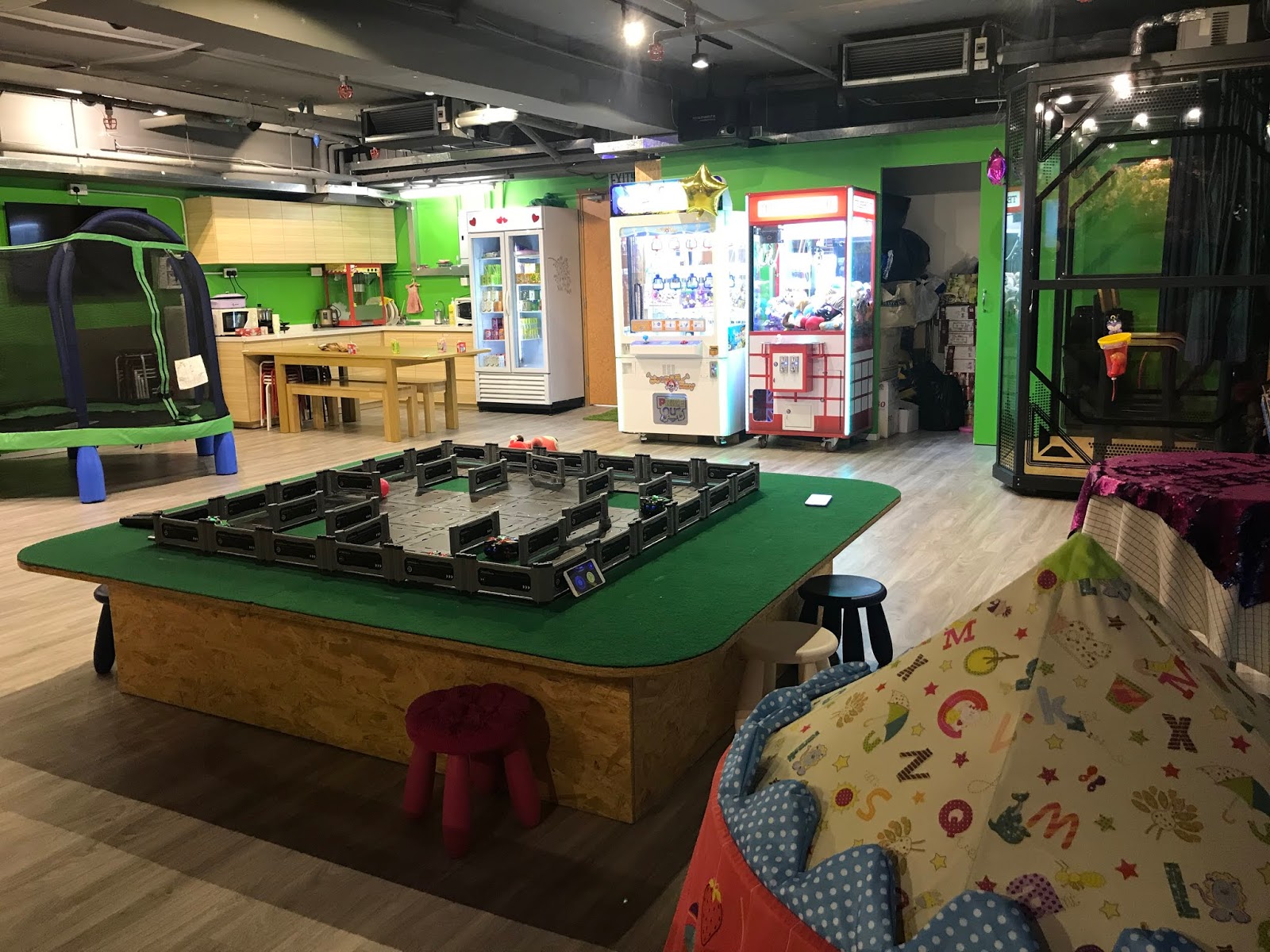 雖然場內只有2000尺,但卻最多可容納70人,而且場內設施豐富,包括:櫻花樹主題發光波波池/I pad遙控賽車/Spider Man籃球五子棋/錄音唱K房/投影機/小小彈彈床/Lego畫板/電動麻雀枱/飛鏢機/夾公仔機/Switch/街機/Board Game及開放式廚房。