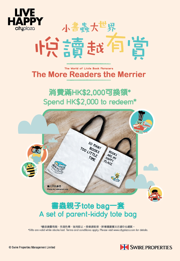 換領方法:顧客於太古城中心以即日電子貨幣消費滿HKD 2,000或以上,即可換領書蟲親子tote bag一套。