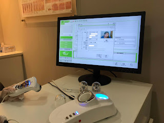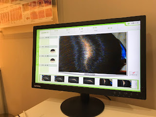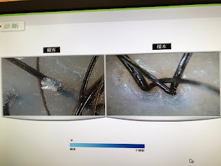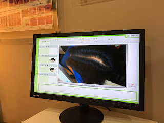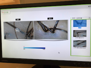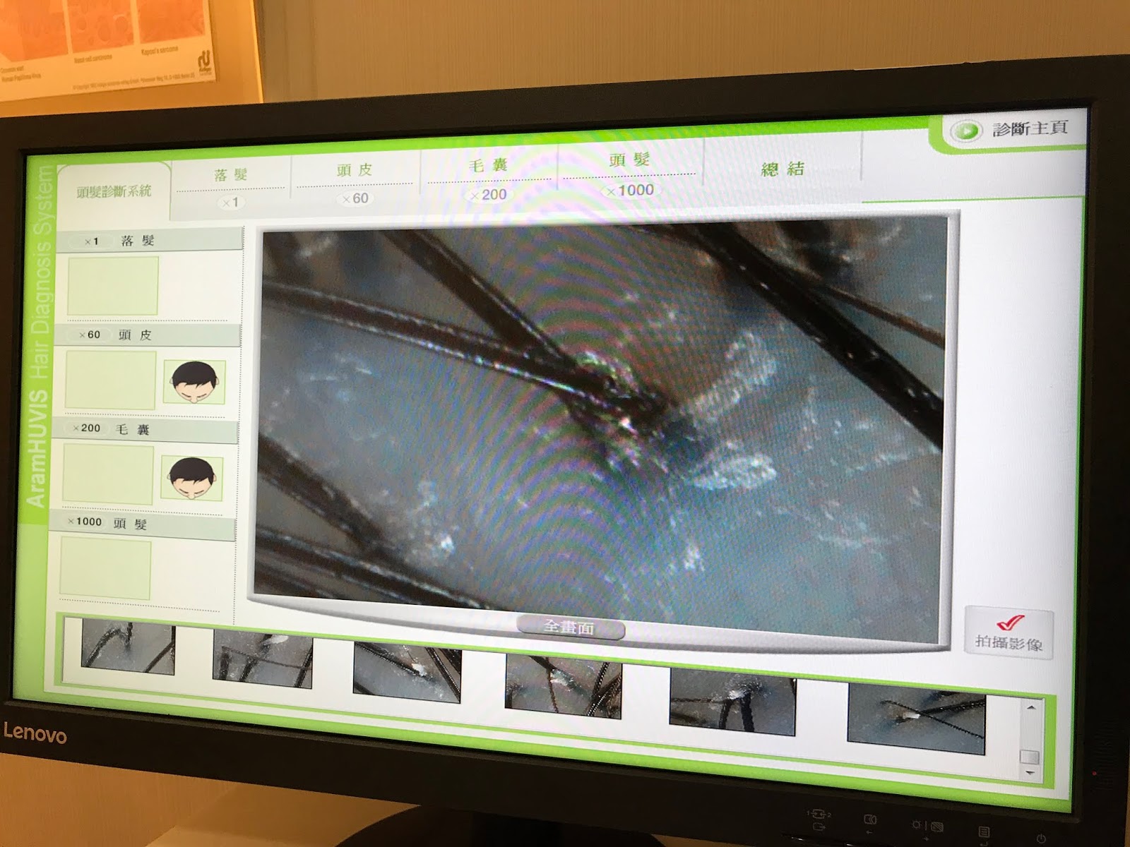 填寫完個人資料及問卷後,先由專業的髮理顧問於獨立房間作頭皮和頭髮分析。髮理顧問先會簡單詢問我的日常飲食、生活作息、這一年去髮廊整理頭髮的次數、甚至詢問使用那類頭部護髮產品等等。之後,髮理顧問再以頭皮分析機為我分析頭皮的健康狀況。這部頭皮分析機大可分為60倍放大分析頭皮問題及200倍分析毛囊問題。