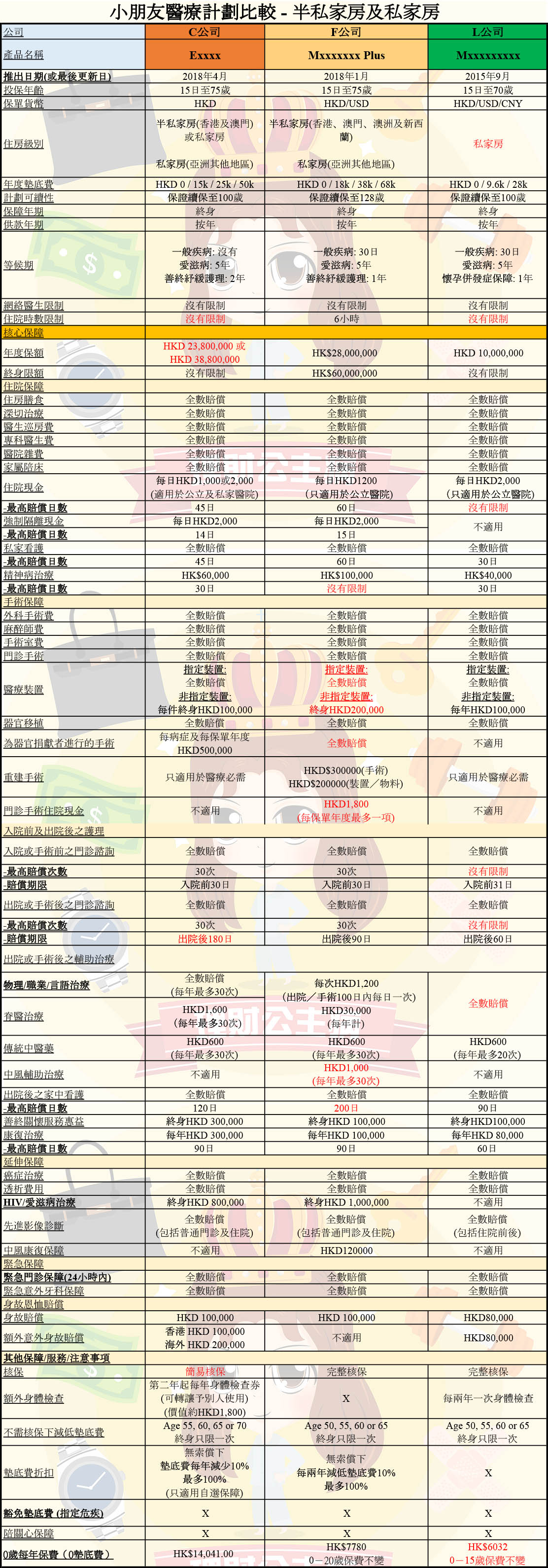 市面上有唔少保險計劃,但BB買的話價錢會貴d。但近期有公司推出高端醫療計劃,年保額1000萬,基本上入院洗費都能夠cover,現時小朋友保費平均每月若500元,仲入住私家房。送上比較表: