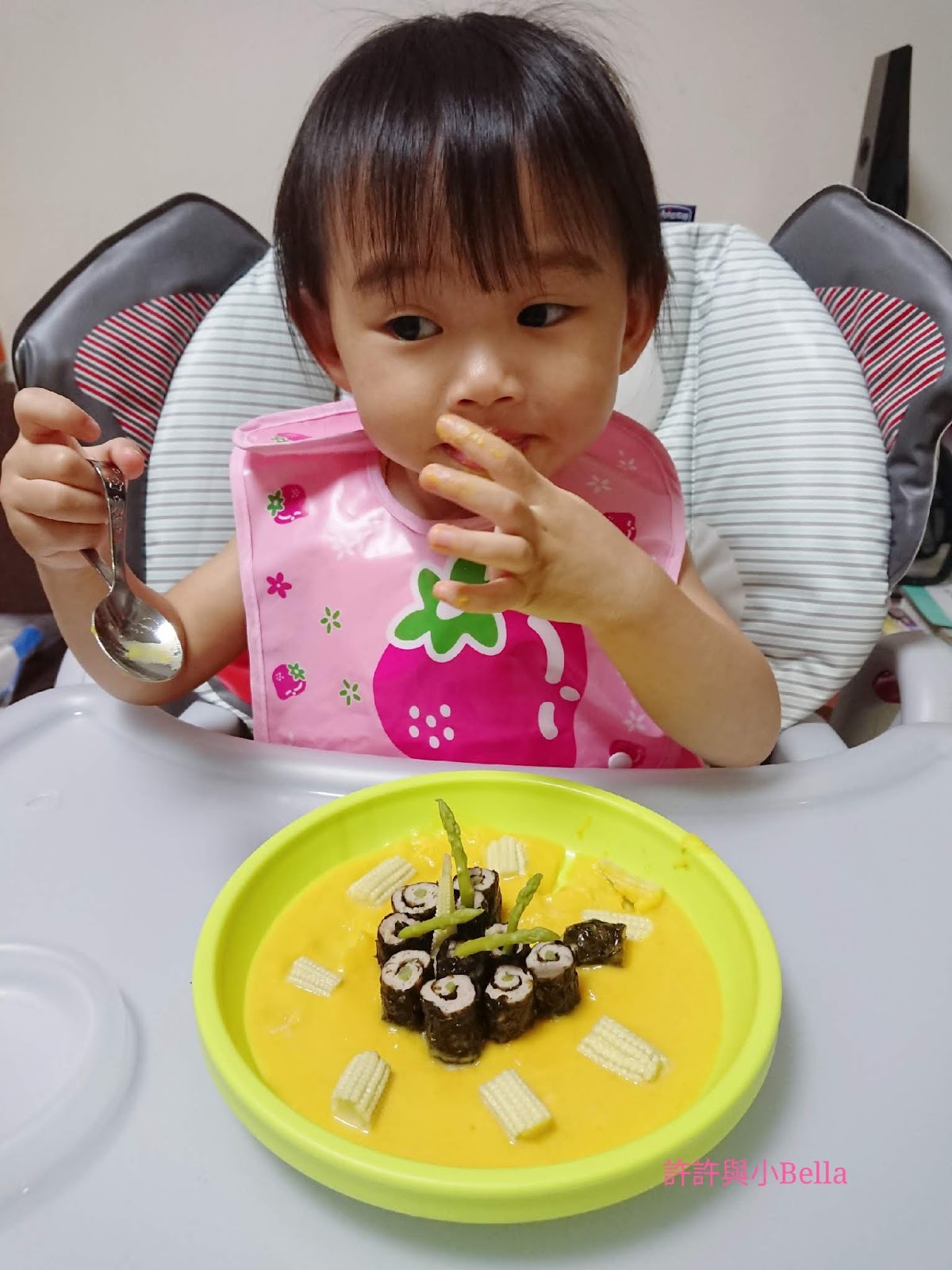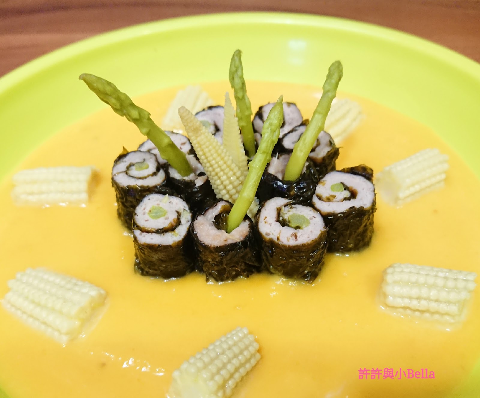 【所有材料9個月大就食得 可以根據BB月齡改變尺寸 簡單製作迷你紫菜蘆筍豬肉卷拌南瓜汁】