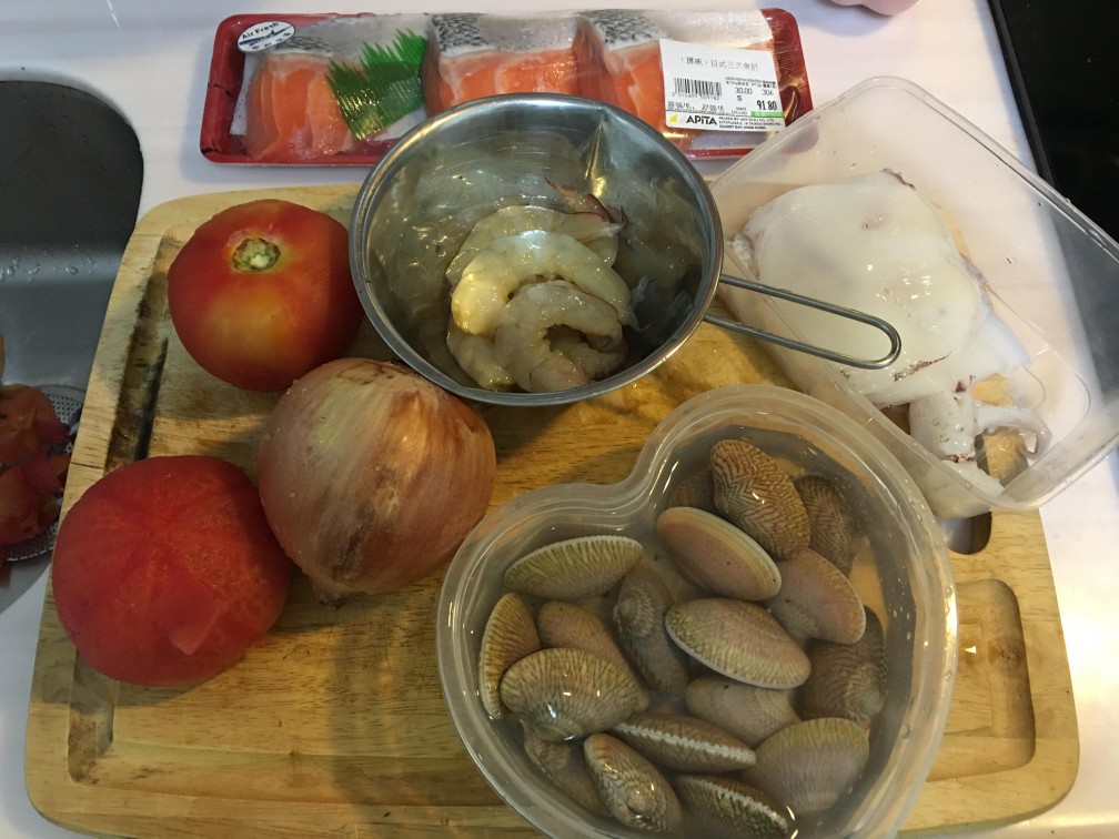 出街玩咗成日,冇電煮3餸一湯,返屋企時叫老公湊米豬返去沖涼先,我快掃一轉街市!休漁期似乎完咗,檔檔d海鮮都好靚, 就整個鮮茄海鮮意粉全家一齊食啦!