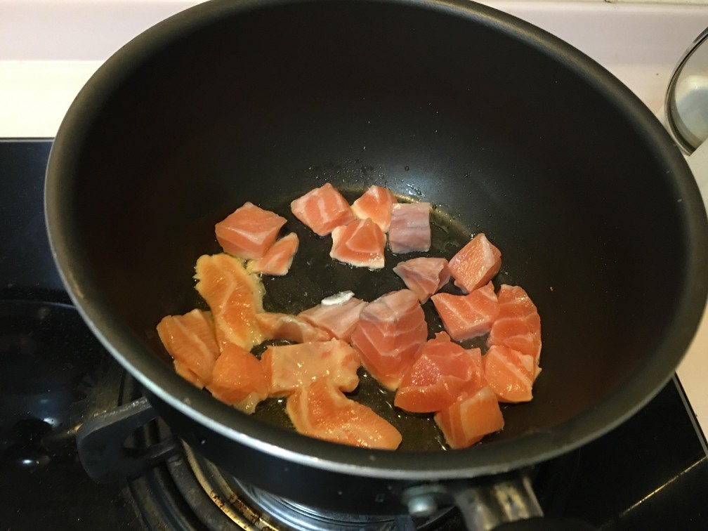 4. 三文魚扒去皮切大粒, 略煎