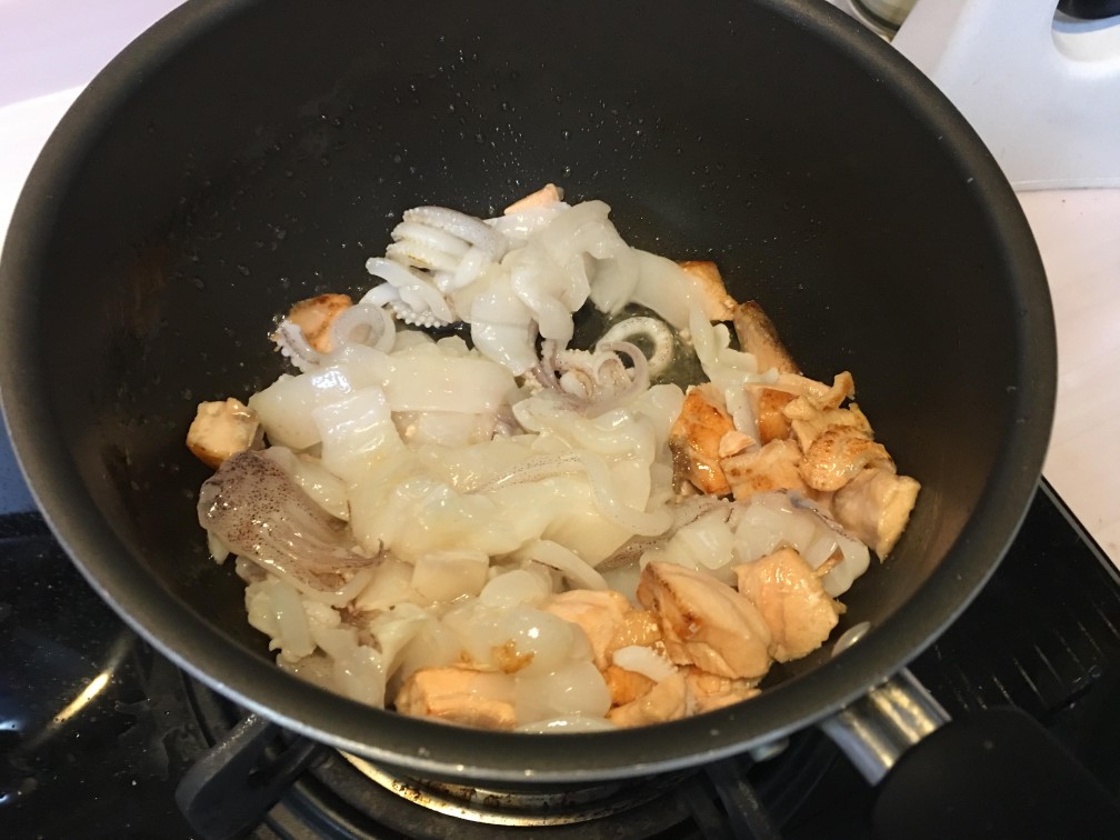 5. 三文魚變晒色後, 落埋魷魚炒炒佢