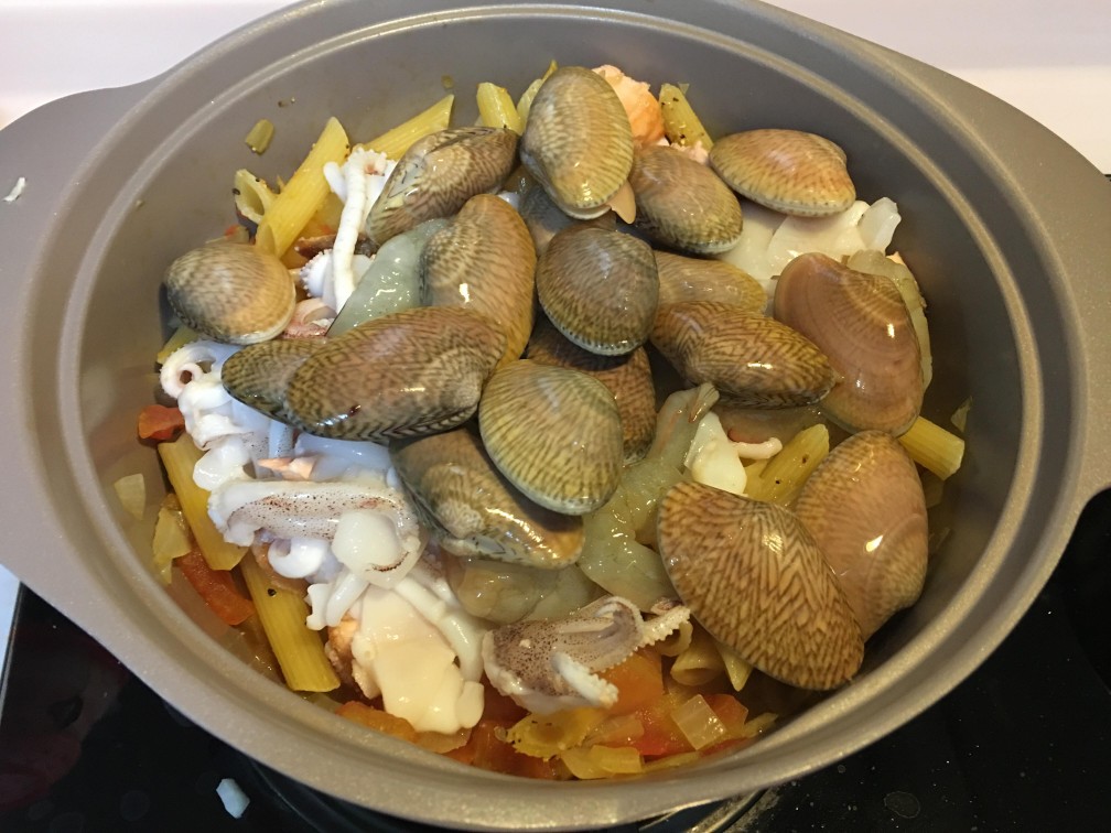 8. 所有海鮮倒晒落煲, 冚蓋煮8分鐘