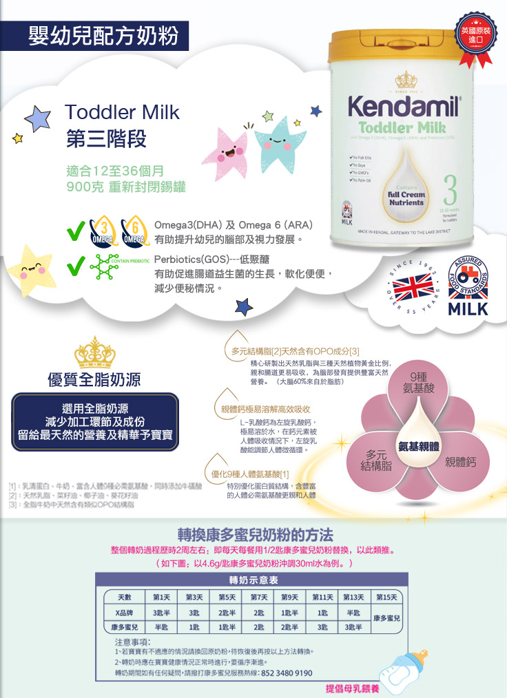 英國Kendamil,係唯一英國製造嘅嬰幼兒全脂成份配方奶粉。出自天然有機嘅生態牧場,而Kendamil 嘅奶廠(KNC) 位於英國湖區 (Lake District),呢度已被聯合國教科文組織列入為『世界文化遺產』。整個環境生態都好好,絶對唔需要擔心係毒奶粉假奶粉啦。Kendamil 係全脂配方奶粉,將全部最豐富、最有營養、最有益、最好嘅乳脂保留返喺牛奶裡面,而唔係將佢哋『脫』咗出嚟。可以減少額外添加,又減少加工過程,所以產品嘅成份就更加天然,對BB吸收就更加好。
