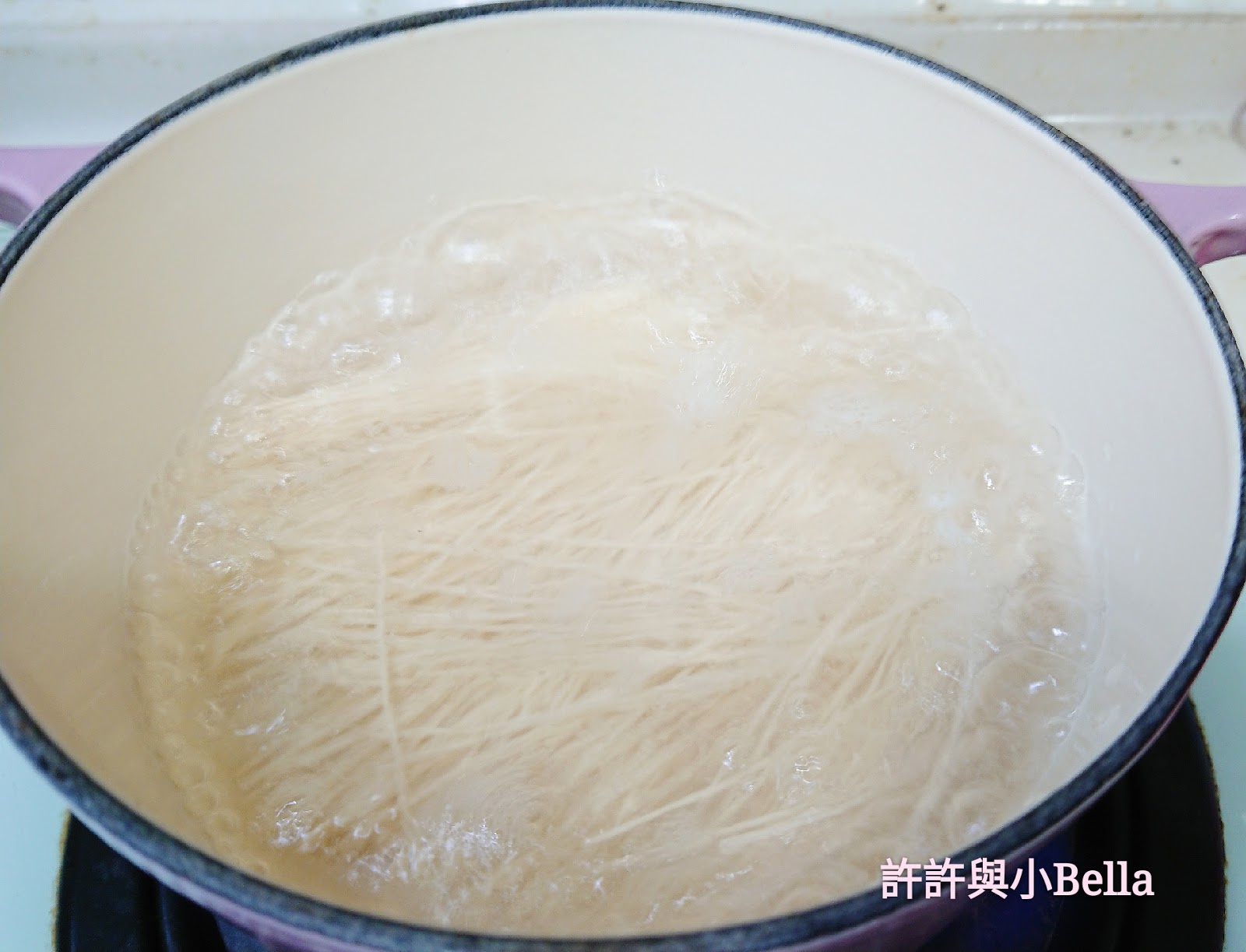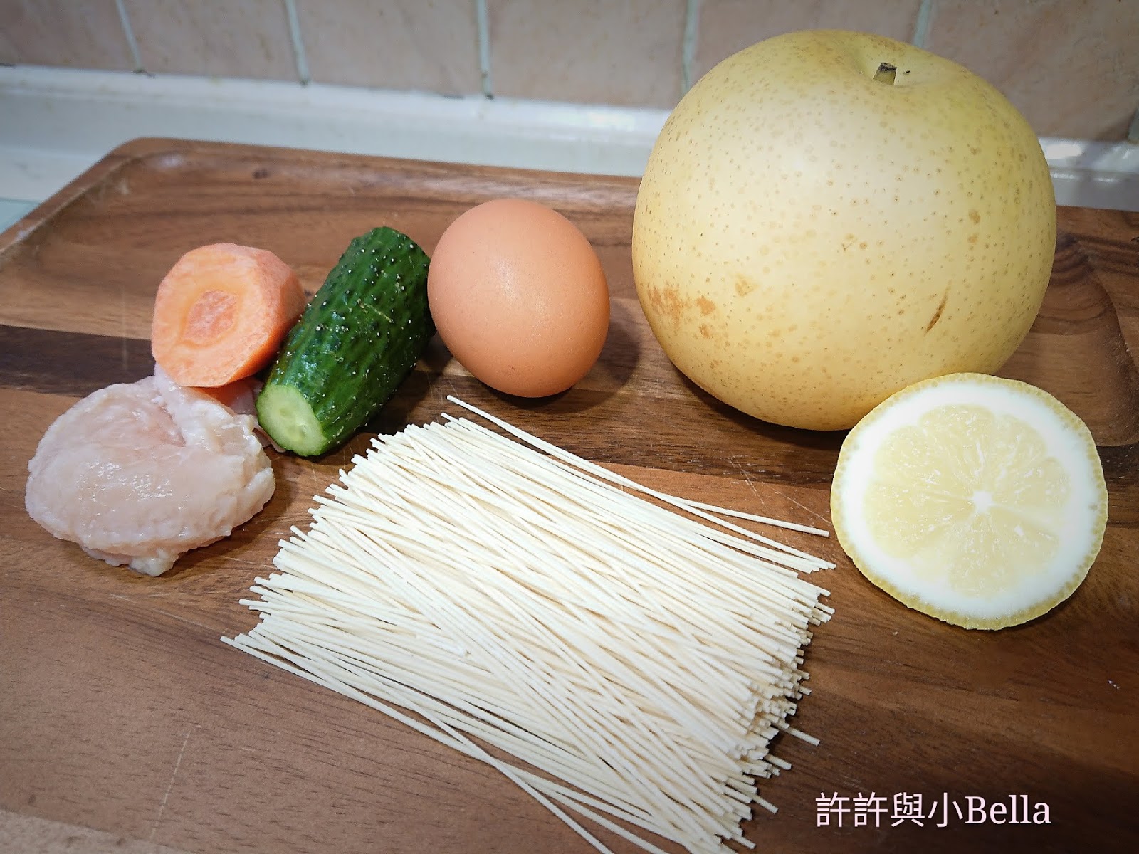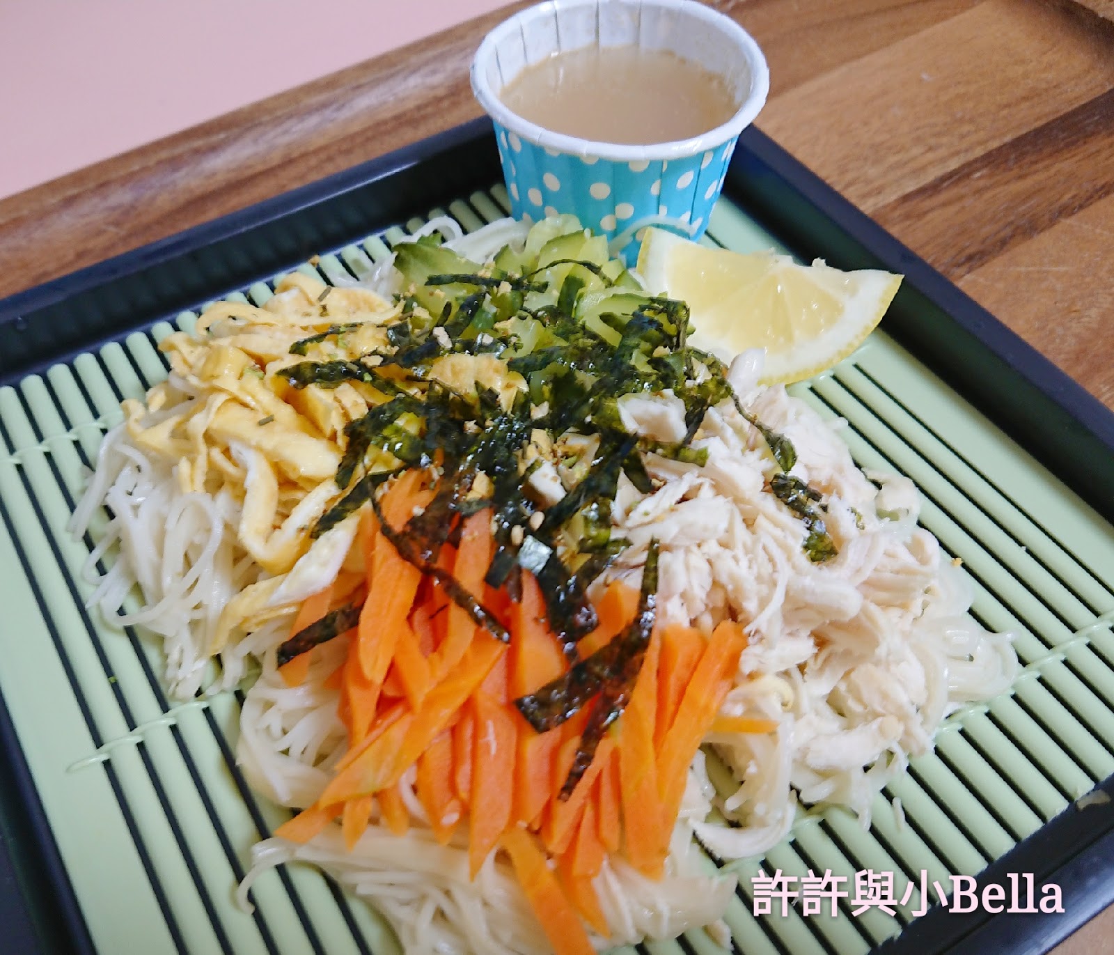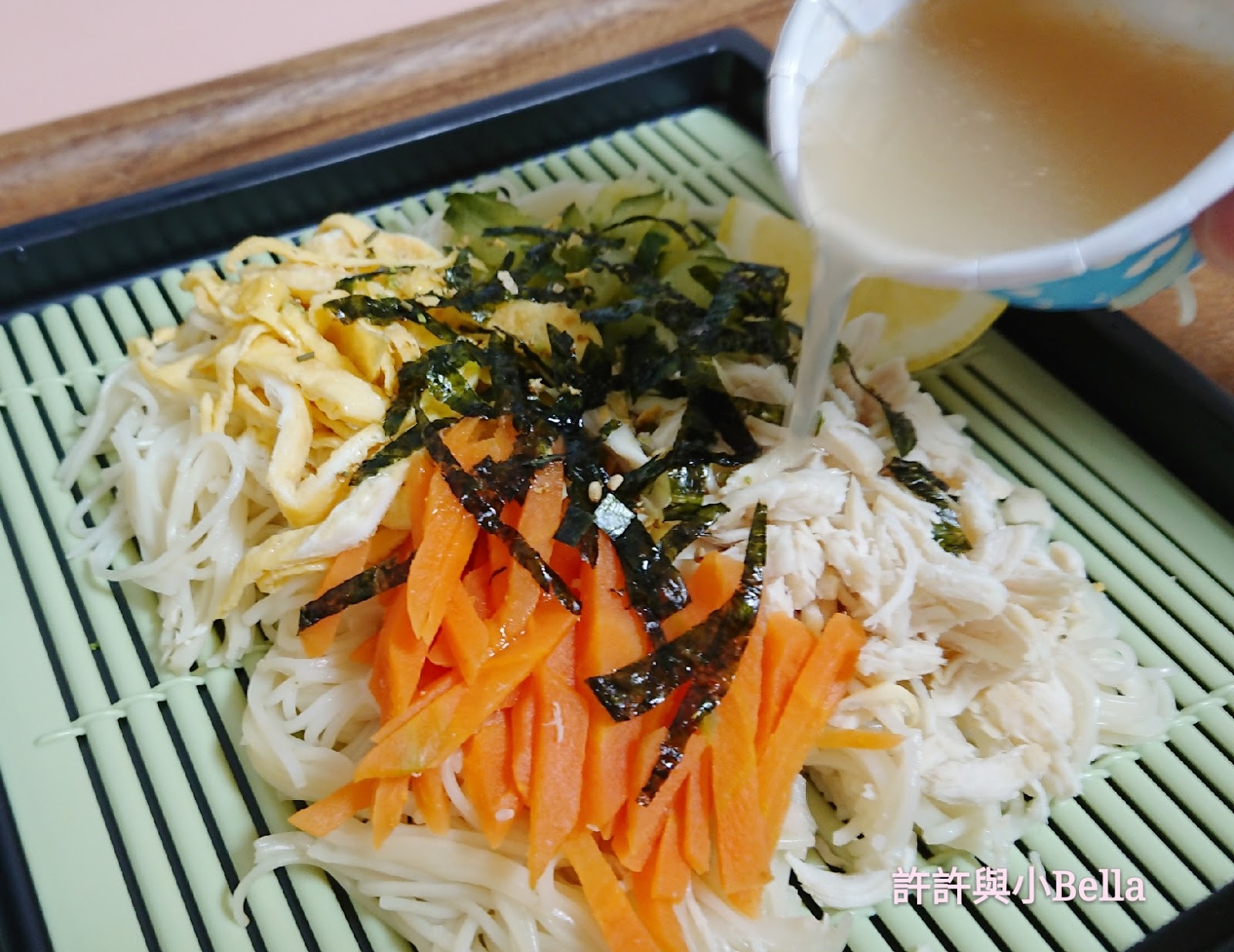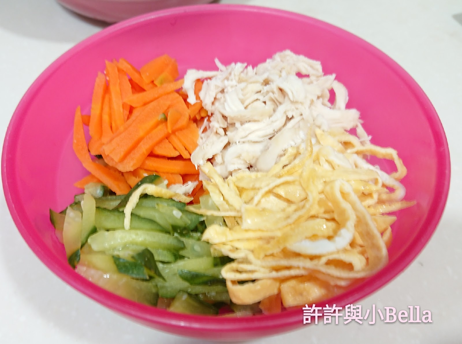 7. 把麵平鋪在碟上,分別放蛋絲,雞絲,青瓜絲及紅蘿蔔絲,再灑上少許紫色。吃時淋上梨汁拌勻,喜歡可加兩滴鮮檸汁。