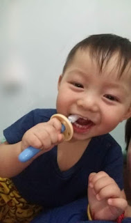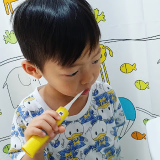 到大一點的時候,就換上bb牙刷,每天早晚飯後,都跟他一邊唱刷牙歌一邊刷牙,讓他逐步體驗刷牙的感受。
