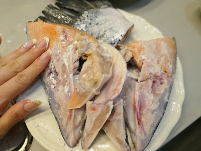 1. 三文魚頭先洗淨, 然後撲點生粉。