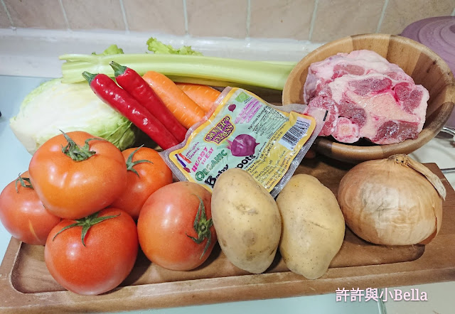 所以今日一早去街市執料,呢個份量只係我買嘅1/3,淨低嘅已經塞爆左雪櫃,而呢到已經可以煲到一大鍋,好彩我個煲夠大。羅宋湯嘅材料如下,個人覺得少一樣野個味都唔會似,頂多似雜菜湯,而且一定要煲牛,我用左牛尾,也可以用牛展肉,牛肋條來煲。