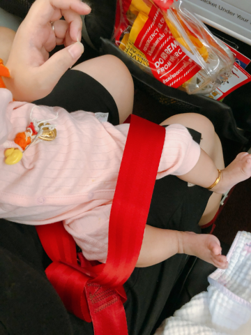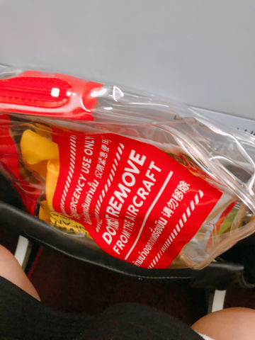 係飛機上 西瓜妹係跟我同婆婆坐 旁邊係無人。上到機 會有空姐拎條bb安全帶同求生工具黎講解 bb既求生工具直接放椅背的因為我抱住左西瓜妹 安全帶係會連接住我個條