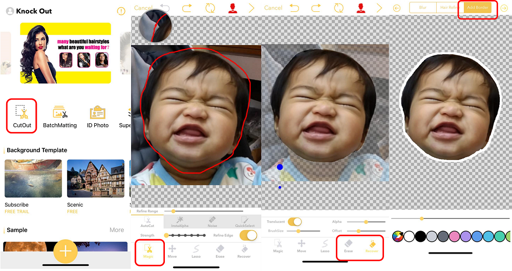用Magic button (左下角) 去剪圖,再用Erase/Recover去執番靚D邊位,然後就按 > (右上角) ,去到下一步可以揀Blur/Hair Refine/Add Border,Border可以揀唔同色~
