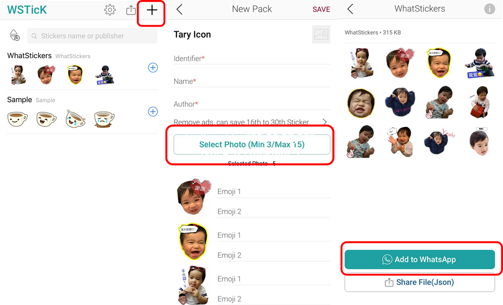 按+ (右上角) –> 揀相 –> SAVE,然後去番App首頁,按save咗嘅stickers一下,再Add to WhatsApp,就大功告成喇!!!!
