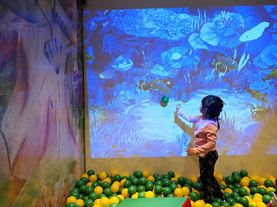 波波池一端有投影機, 可以看着屏幕玩互動拋球遊戲.