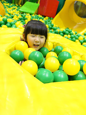 一進場, 小朋友們魚貫跳落巨型波波池. 這波波池真的超級大! 而且波波量相當充足, 黃綠色夾集, 色彩繽紛, 一望無際. 原來不止小朋友,波波池對爸爸媽媽也有種魔力, 因為夠大, 我們一併入去玩也絕無問題.