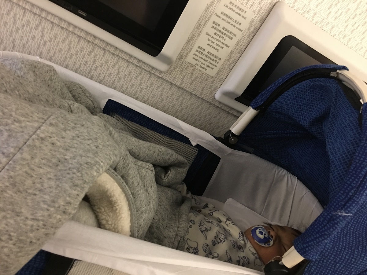 起飛後,空姐們會預備BB籃,記得BB籃要喺訂票後預先預留,同埋睇番BB籃係咪適合你嘅BB用,一般都係12KG以下嘅BB,但如果BB身形好長/好大隻就可能訓得唔太舒服。好彩及及兩次旅行都夠訓,同肯訓BB籃,我就輕鬆得多 ;)