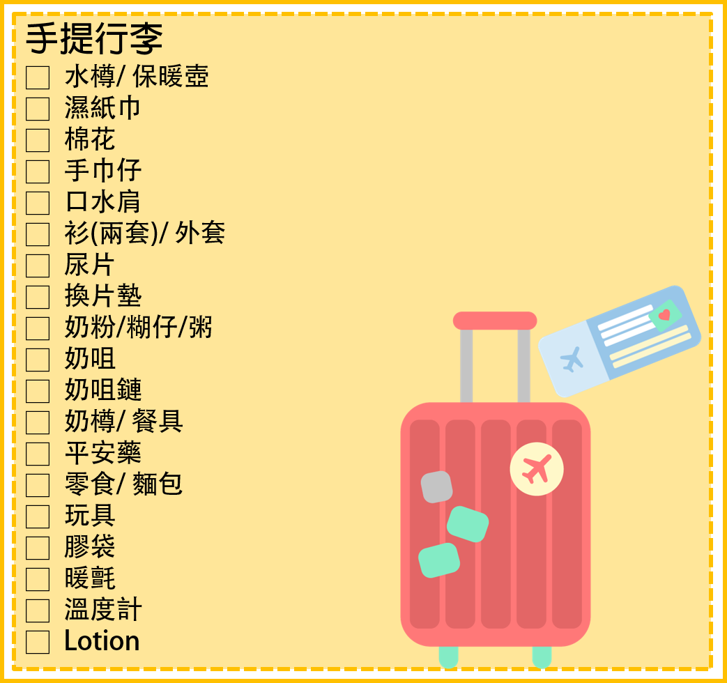 經濟艙手提行李一段都係約7-10KG (視乎航空公司), 基本上BB嘅野都已經可以放滿哂。除咗帶平時出街會帶嘅野之外,奶粉一定要帶多少少,如果唔係BB喺飛機要扭奶食就真係可能冇人幫到你,人奶媽媽就可以帶定哺乳圍方便餵奶/泵奶,但記得要自備冰袋,因為空姐唔會幫你雪奶。另外,衫仔最好準備多套,如果BB整污糟/濕咗都可以替換。平安藥要跟身,以防萬一BB喺飛機有咩唔舒服都可以食,最好有埋BB名,因為有D國家帶藥物入境可能要申報。