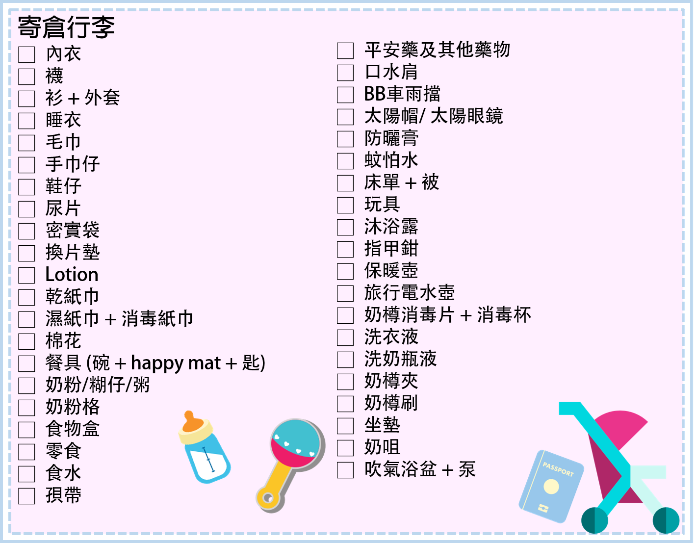 寄倉行李基本上差唔多將成個屋企用開嘅BB嘢執哂去,驚BB水肚不服可以帶備蒸餾水,其他外出用品視乎當地氣候,夏天最好就帶埋防曬用品。如果怕酒店浴缸唔乾淨就可以帶吹氣浴盆/吹氣椅俾BB洗白白~