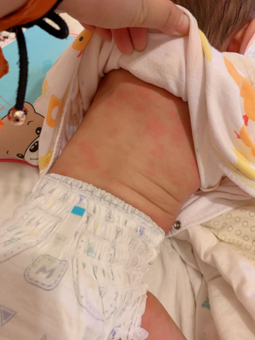 佢只係食左5-6啖 之後開始抓頸一睇 紅唒!全身都係連埋patpat..好似蚊咬咁!之後立即比水佢飲沖淡 留意左1小時無異常 終於散唒。(如果敏感嚴重係有機會致命,所以一有呼吸困難/異樣 立即就醫!)