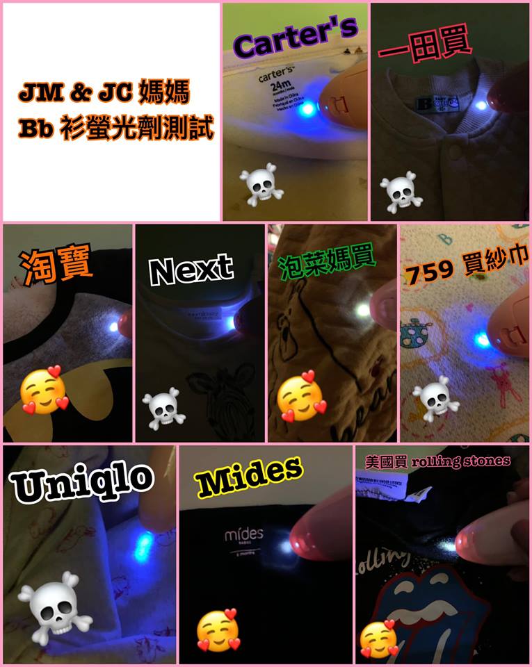 以下呢張圖有顯示結果。發現得淘寶一間店買既衫、係fb 泡菜媽買既背心、mides 既連身衣、美國買不知名牌子叫rolling stones 不含螢光劑,其他牌子都有。我有睇過係咪無論咩牌子只要淺色衫就有、深色就無呢?結果又唔係啵