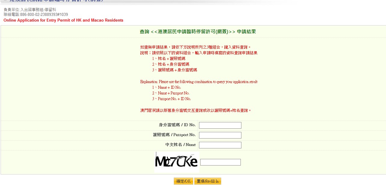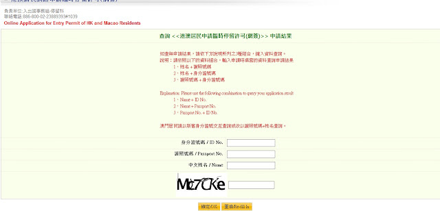 查詢 <<港澳居民申請臨時停留許可(網簽)>> 申請結果