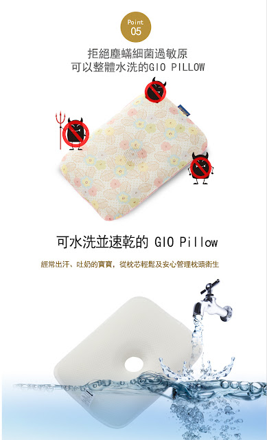 GIO Pillow的超透氣護頭型枕頭獲得「預防、改善因睡姿引起的頭型變形」專利認證,依照亞洲BB的平均頭圍發展設計,除了透氣性強,更能幫助分散BB後腦的重量,讓BB發展出自然的頭型,避免頭部位置受壓而變得扁平。加上採用了天然物質進行除蟎,可以保護BB皮膚。