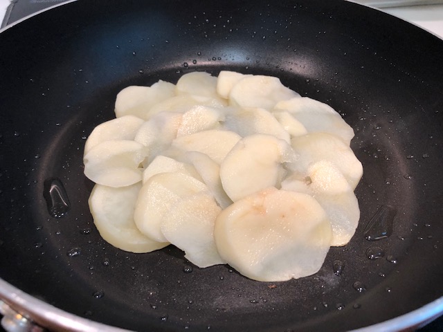 4. 把薯仔片鋪在平底鑊,蓋上鑊蓋煎