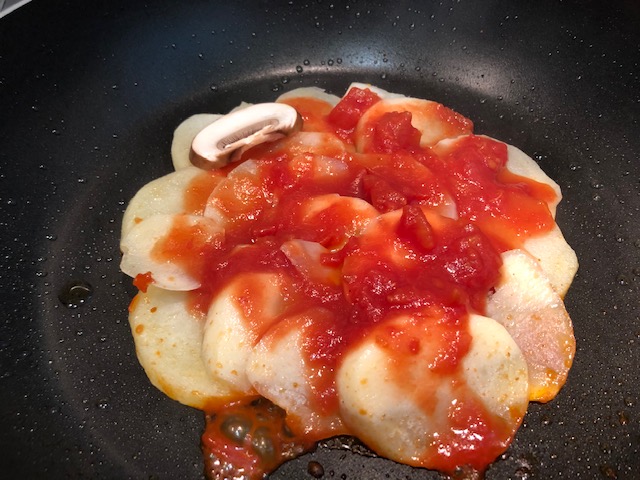 5. 薯仔片開始呈現半透明時,塗上一層蕃茄醬,再鋪上蘑菇片,蓋上鑊蓋煎至蘑菇熟