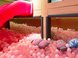 超夢幻的波波池啊!一進場我的眼球就已經被這粉紅色波波吸引過去了(媽媽少女心立即發作!)。您以為粉紅色就是女孩子的專利?不!波波池的牆上還有不同難度及適合男孩子的籃球框架!而且更有男女小孩都愛的溜滑梯呢!