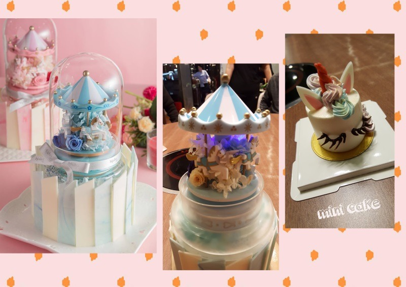 細佬b一歲正日生日訂哩款木馬蛋糕 主要係因為佢個Merry go round音樂盒配上保鮮花