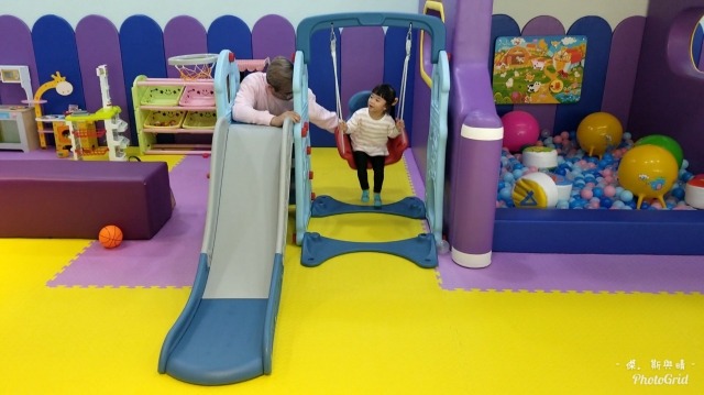 係小型波波池旁邊仲一座滑梯及秋韆架。