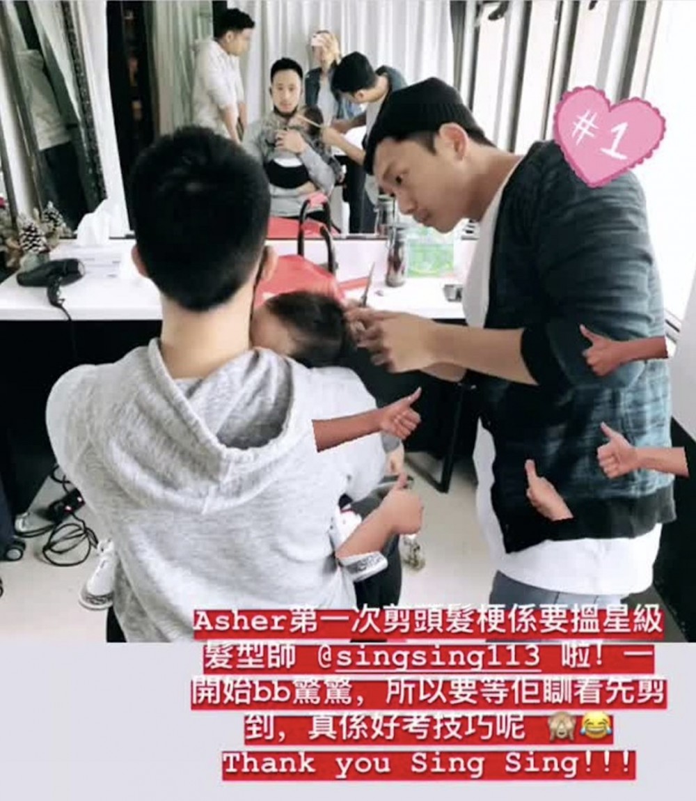 圖中可見,Asher由爸爸Brian抱住,BB安靜又乖巧咁挨住喺爸爸膊頭度,原來佢已經瞓著咗!Kary解釋,囝囝原來好驚剪頭髮,驚到完全剪唔到,要等Asher瞓咗,先可以動刀。要幫熟睡中嘅BB剪頭髮真係唔簡單,難怪Kary都話真係「好考技巧」,真係要畀個like髮型師啊!