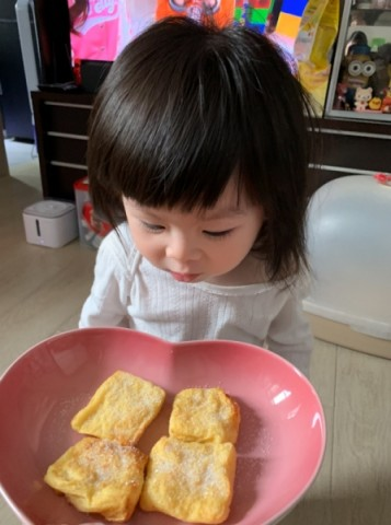 每日要諗蠔豉妹妹下午茶真係人都癲... 除左包加生果外,媽媽真係無乜idea~ 只好係包既身上搞搞新意思~ 之前我咪話過陀住蠔豉妹妹時好鐘意食西多士既! 所以今次我就決定試下整西多士俾佢試下~