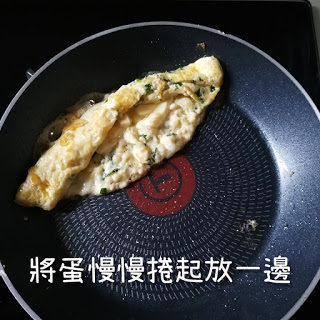 5. 中火落油起鑊,開始煎蛋,先倒一半蛋汁
