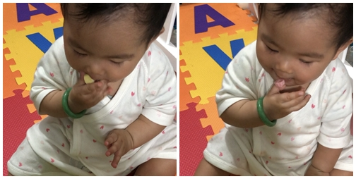 為食既麥皮妹妹已經識拎細細粒既食物放入口架啦"*