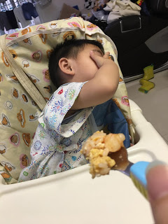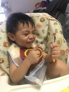 米豬唔食飯!! 媽媽: 消防員姐姐上次話, 消防員個個都自己食一大碗飯, 自己不仲食得好快ga wo~ 你唔食飯咁你一定唔係消防員喇 (扮收碗) 極速爬上highchair: 米豬而家食!