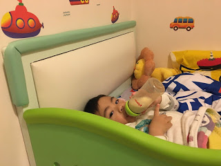 之但係, 米豬大個仔, 張BB床已經唔夠佢瞓喇, 一轉側踢到床就醒, 我就晚晚醒幾次拍返佢瞓, 如果同我地一齊瞓, 佢又要H字咁瞓, 仲要加埋旋風腿, 連爸爸都冇覺好瞓, 所以分房瞓呢件事, 我地決定响農曆新年前執行~!